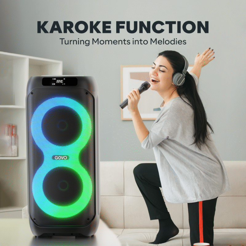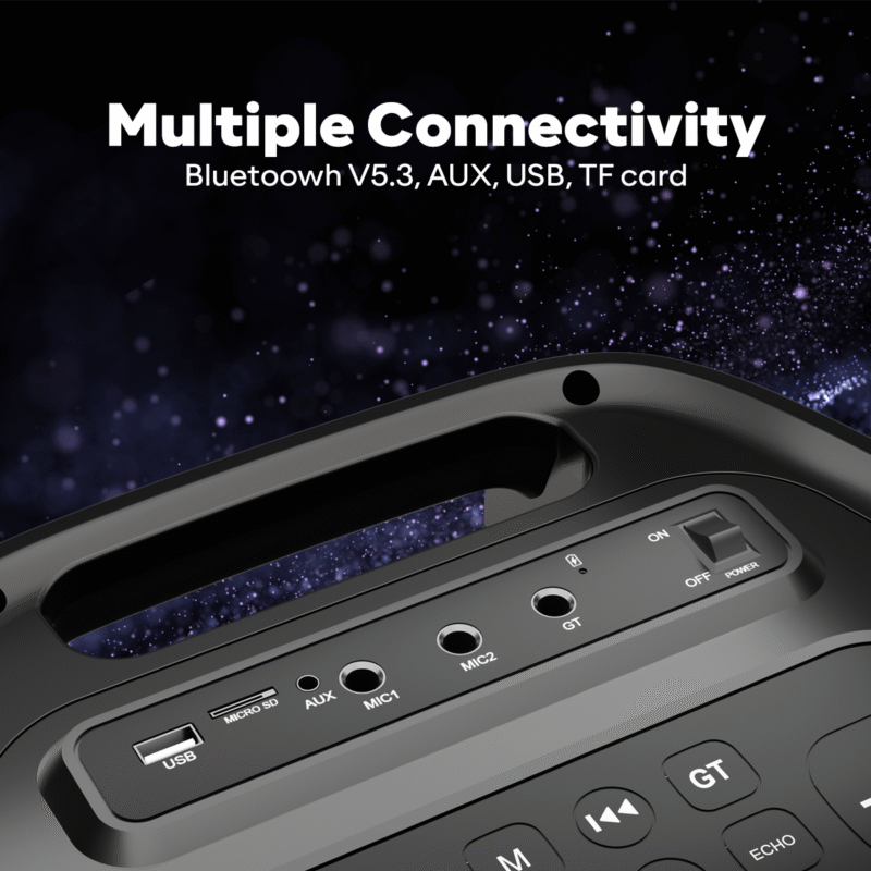 It’s built for non-stop fun. Bluetooth 5.3 keeps the music flowing without a glitch, while the 6000mAh battery makes sure the party doesn’t cut short before the sunrise. Want karaoke? Plug in the mic that comes along. Got a guitar riff ready to shake things up? Slot it in and jam away. The GOLOUD 980 doesn’t just play music—it hands you the stage.